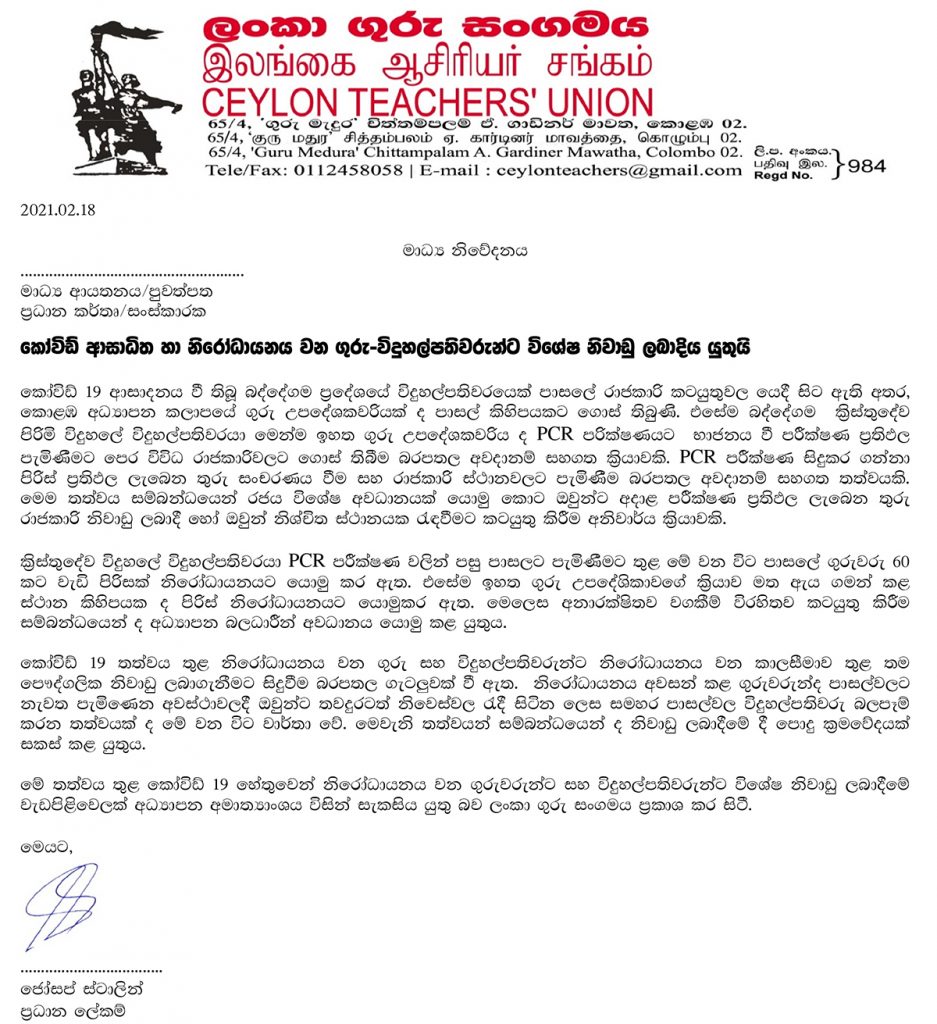 ඔවුන් මෙම නිවේදනය නිකුත් කර ඇත්තේ ඊයේ (18) කොරෝනා ආසාදනය වූ බවට තහවුරු කරගත් බද්දේගම ක්රිස්තුදේව පිරිමි විද්යාලයේ විදුහල්පතිවරයා සහ කොළඹ අධ්යාපන කලාපයේ ගුරු උපදේශකවරියකගේ සිද්ධි පදනම් කරගනිමිනි.