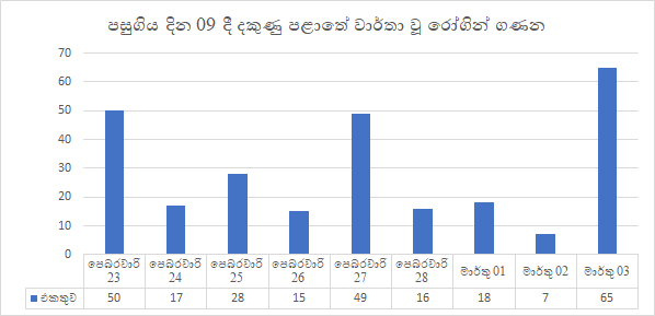 ඊයේ දිනය ද ඇතුළුව පසුගිය දින 09ක කාලයේ දී දකුණු පළාතේ ඒ ඒ දිස්ත්රික්කවලින් රෝගීන් වාර්තා වූ ආකාරය අනුව ඊයේ රෝගීන් වාර්තාවීමේ වැඩිවීමක් දක්නට ලැබෙන බව පැහැදිලි වෙයි. එම වගුව පහතින් දක්වා ඇත.