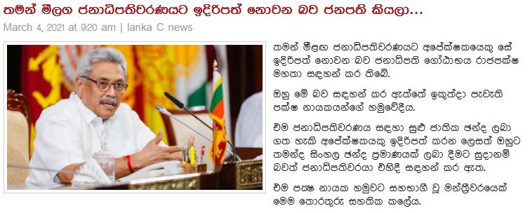 ජනාධිපති ගෝඨාභය රාජපක්ෂ මීළඟ ජනාධිපතිවරණයේ අපේක්ෂකයකු ලෙස ඉදිරිපත් නොවන බව කියා ඇතැයි ඇතැම් මාධ්යවල ප්රචාරය වෙමින් තිබේ.