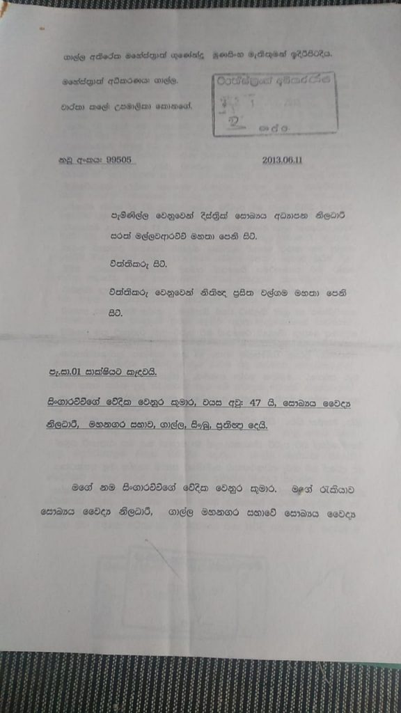 පැමිණිල්ලේ සාක්ෂි වශයෙන් එවකට ගාල්ල මහ නගර සභාවේ සෞඛ්ය වෛද්ය නිලධාරීවරයා වූ සිංගාරච්චිගේ වේදික වෙනුර කුමාර හෙවත් වෙනුර සිංගාරච්චි කැඳවන ලදී. විත්තිකරුගේ නීතිඥ ප්රසිත වෙල්ගම පැමිණිල්ලේ සාක්ෂි කරුගෙන් හරස් ප්රශ්න අසන්නට වූයේය.