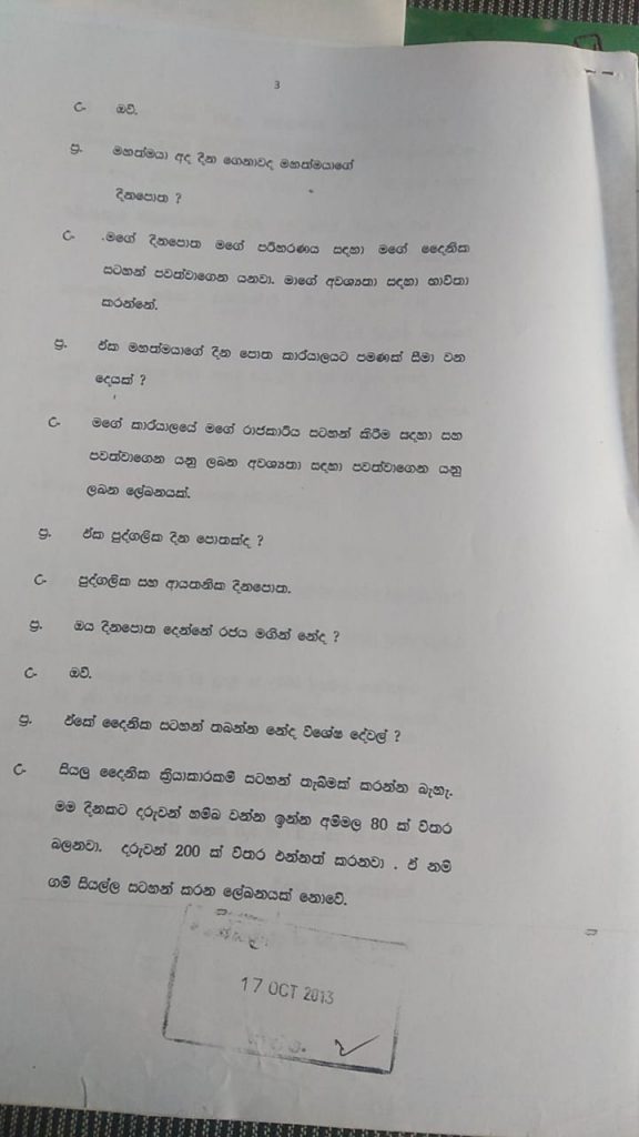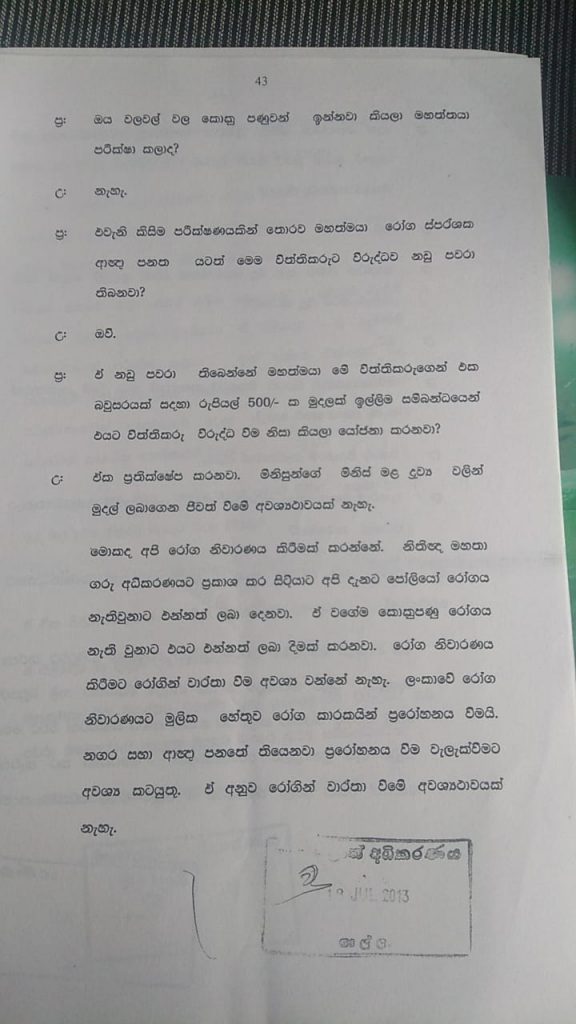 පි : එ්ක ප්රතික්ෂේප කරනවා. මිනිසුන්ගේ මිනිස් මළ ද්රව්ය වලින් මුදල් ලබාගෙන ජීවත් වීමේ අවශ්යතාවක් නැහැ. මොකද අපි රෝග නිවාරණය කිරීමක් කරන්නේ. නීතිඥ මහතා ගරු අධිකරණයට ප්රකාශ කර සිටියාට අපි දැනට පෝලියෝ රෝගය නැතිවුණත් එන්නත් ලබා දීමක් කරනවා. රෝග නිවාරණය කිරීමට රෝගීන් වාර්තා වීම අවශ්ය වන්නේ නැහැ. ලංකාවේ රෝග නිවාරණයට මූලික හේතුව රෝග කාරකයින් ප්රරෝහණය වීමයි. නර සභා ආඥා පනතේ තියෙනවා ප්රරෝහණය වීම වැළැක්වීමට අවශ්ය කටයුතු. ඒ අනුව රෝගීන් වාර්තා වීම අවශ්යථාවක් නැහැ.