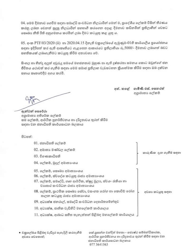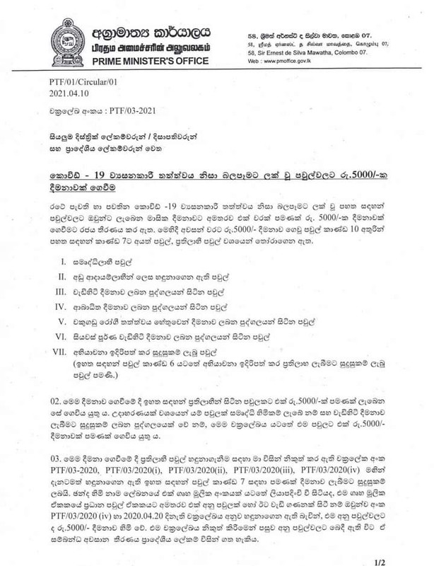 අලුත් අවුරුදු උත්සව සමයේ රුපියල් 5000.00ක දීමනාවක් ලබාදීමට අදාල චක්රලේඛය රජය විසින් නිකුත් කර ඇති අතර කොරෝනා වසංගතය හේතුවෙන් ආදායම් අහිමිවූවන්ට මෙම දීමනාව ලබාදෙන බව රජය පවසයි.