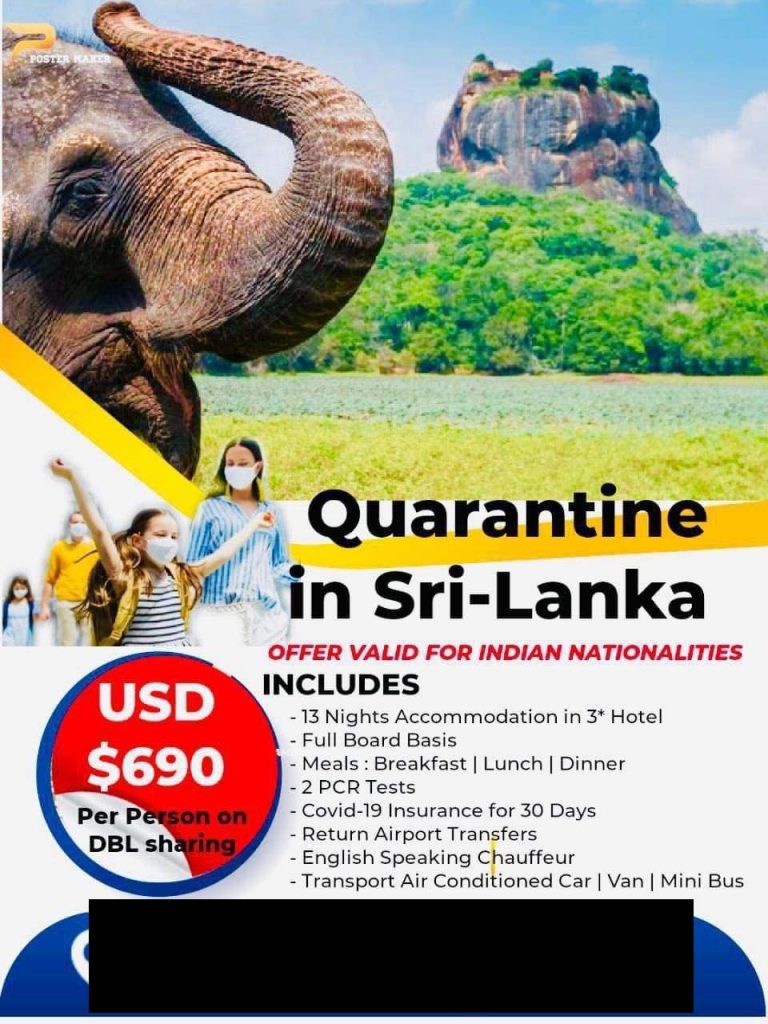 ඉන්දියාවේ පුරවැසියන්ට මෙරට දී ඇමෙරිකානු ඩොලර් 690ක් වැනි මුදලකට සුව පහසු හෝටල්වල රාත්රී 13ක නිරෝධායන කාලයක් ගත කළ හැකි බවට එක්තරා පුද්ගලික ආයතනයක් විසින් අන්තර්ජලායේ පළකර තිබූ දැන්වීමකට අනුව rata.lk අපි ඔවුන්ට කතා කළෙමු.