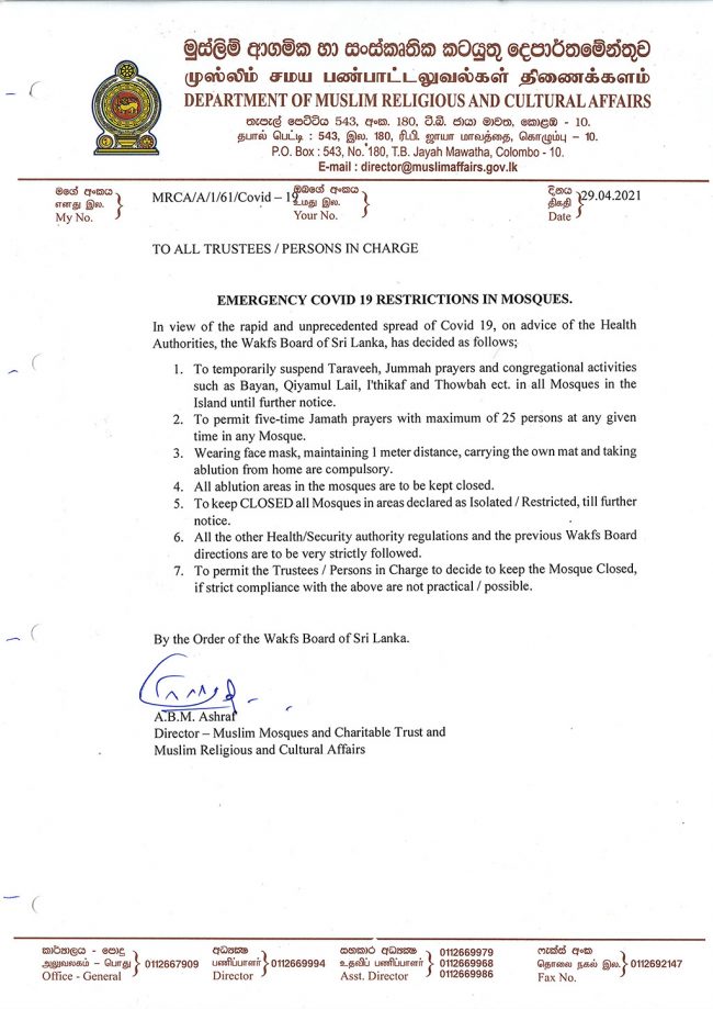 ශ්රී ලංකාව පුරාම කොරෝනා වසංගතය යළි පැතිරයාමේ අවදානමක් හටගෙන ඇති බැවින් සිකුරාදා සහ රාමසාන් දිනවල ඉස්ලාම් දේවස්ථාන ඇතුළු ආගමික මධ්යස්ථානවල විශාල වශයෙන් රැස්වී පැවැත්වෙන ආගමික වතාවත් තාවකාලිකව අත්හිටුවීමට තීරණය කළ බව මුස්ලිම් ආගමික සහ සංස්කෘතික කටයුතු දෙපාර්තමේන්තුව නිවේදනය කරයි.