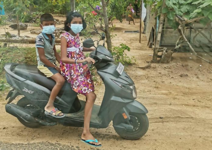 මේ ඡායාරූපයෙන් දැක්වෙන දරුවන් දෙදෙනා අපේ පාඨකයකුගේ කැමරාවේ සටහන්ව ඇත්තේ කරුවලගස්වැව ප්රදේශයේ දී ය. ළමා වියේ පසුවන මේ දැරිය තවත් එවැනිම දරුවකු ද යතුරුපැදියේ පසුපසින් තබාගෙන ධාවන කරන්නීය.