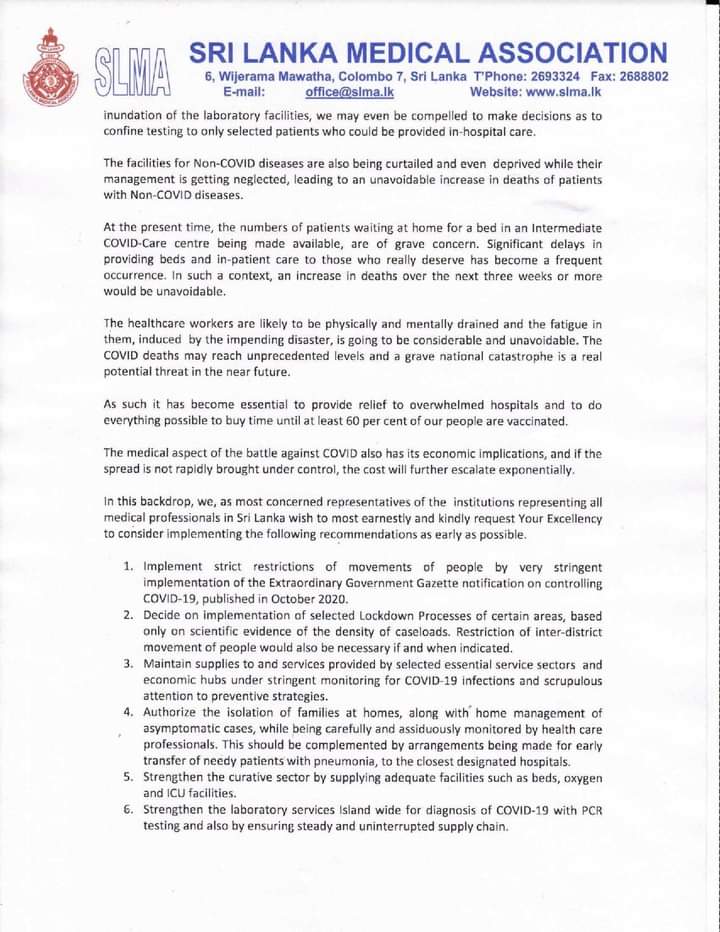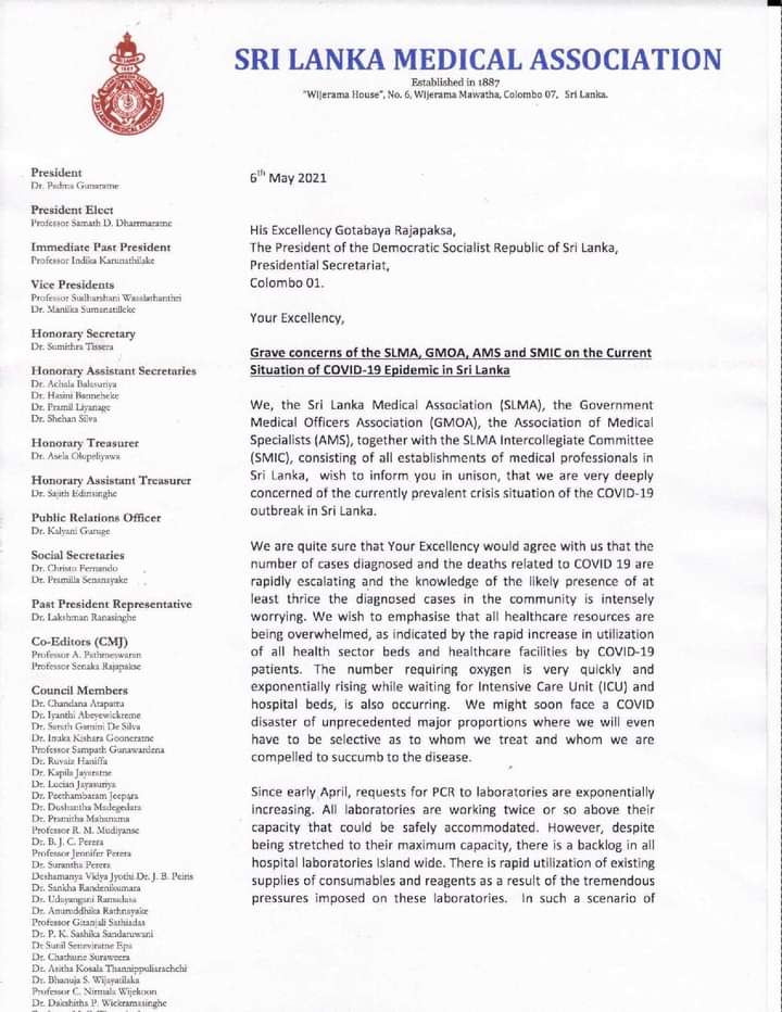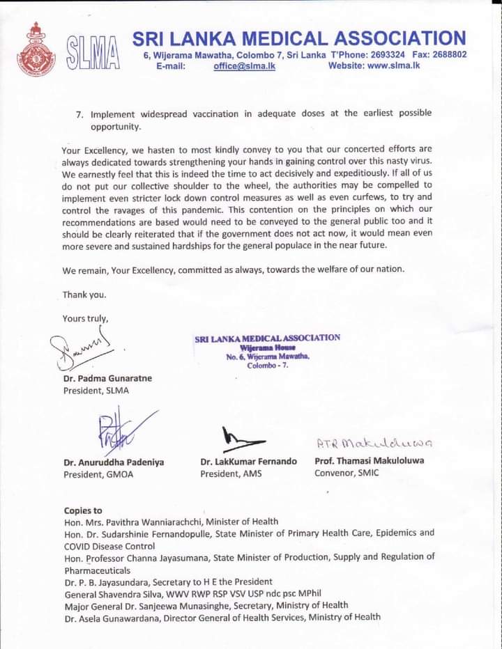 මේ වනවිට රට පත්ව ඇති තත්ත්වය ඉතාමත් තීරණාත්ක හා කඩිනමින් ක්රියාත්මක විය යුතු කාලයක් බැවින් සියලුම දෙන මේ භාරදූර කර්තව්යයට සාමූහිකව උර නොදුනහොත් මේ වසංගතය පාලනය කිරීම සඳහා බරපතල තීරණවලට පවා එළඹීමට සිදුවනු ඇතැයි ඔවුහු එම ලිපිය මගින් දන්වා ඇත.