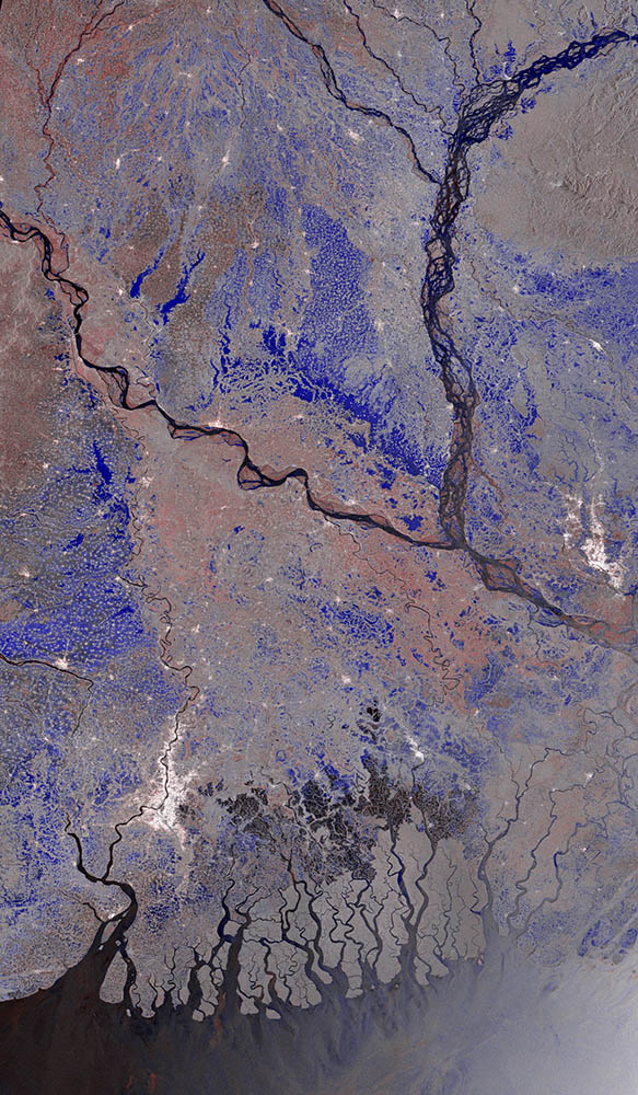 දීප්තිමත් කහ පැහැයෙන් දිස්වන්නේ ගංඟාවයි. එය මුහුදට ගලා යාමට පෙර කුඩා කොටස් වලට බෙදී වෙන්වී පැතලි තැනිතලාව හරහා ගලා බසිස්නේ සුවිසල් ඩෙල්ටාවක් නිර්මාණය කරමිනි. කුඩා විල් හා පොකුණු සිය ගණනක් මෙහි කුඩා තිත් ආකාරයෙන් දිස්වෙයි.