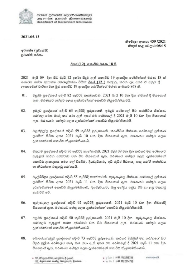 මේ අනුව ශ්රී ලංකාවේ සිදුව ඇති මරණ සංඛ්යාව 868ක් දක්වා ඉහළ ගොස් තිබේ.