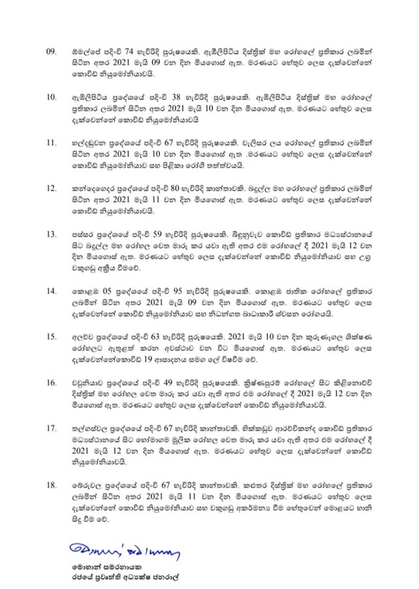 සෞඛ්ය සේවා අධ්යක්ෂ ජනරාල්වරයා විසින් කොරෝනා ආසාදිත මරණ බවට තහවුරු කරන ලද මරණ 18ක විස්තර ඊයේ (12) නිකුත් කර ඇති බව රජයේ ප්රවෘත්ති අධ්යක්ෂ ජනරාල් මොහාන් සමරනායක නිවේදනයක් නිකුත් කරමින් කියා සිටියි.