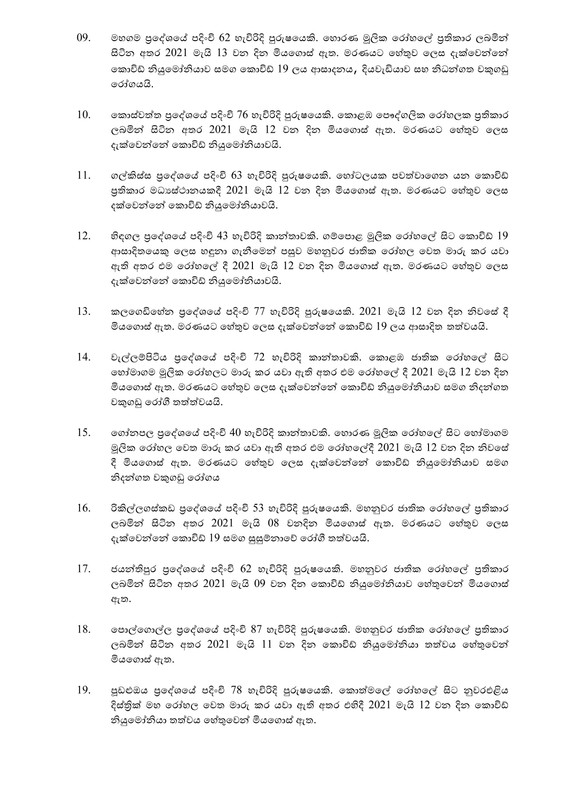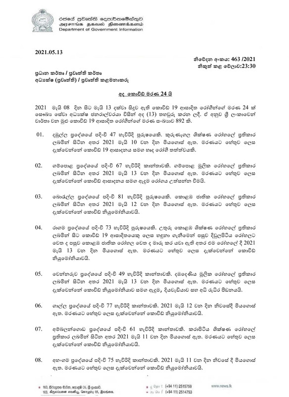 සෞඛ්ය සේවා අධ්යක්ෂ ජනරාල්වරයා විසින් තහවුරු කරන ලද තවත් කොරෝනා මරණ 24ක් පිළිබඳ තොරතුරු රජයේ ප්රවෘත්ති දෙපාර්තාමේන්තුව විසින් නිකුත් කර තිබේ.
