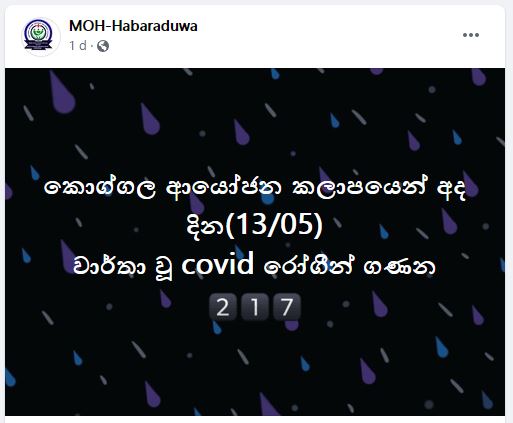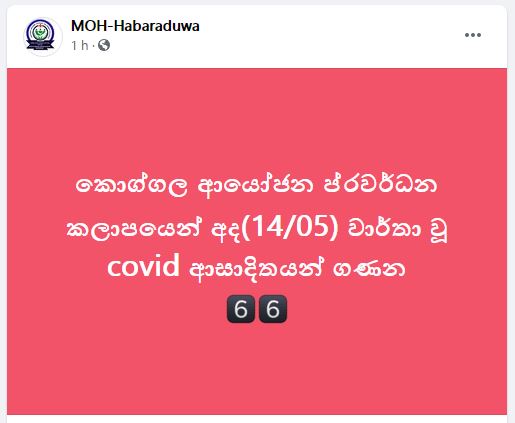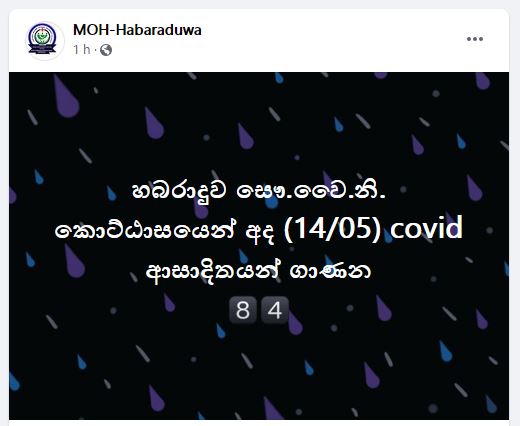 ඊයේ (13) එම පිටුවේ දක්වා තිබුණේ හබරාදුව සෞඛ්ය වෛද්ය නිලධාරී කොට්ඨාසයේ කොග්ගල නිදහස් වෙළෙඳ කලාපයේ පමණක් කරන ලද පීසීආර් 400ක් අතරින් 217 දෙනකු ආසාදිත බව තහවුරු වී ඇතැයි යන්නයි. ඉන් පසු අද එම පිටුවේ දක්වා ඇත්තේ කොග්ගල නිදහස් වෙළෙඳ කලාපයෙන් අද (14) දිනයේ කොරෝනා ආසාදිතයන් 66ක් සමඟ සමස්ත හබරාදුව සෞඛ්ය වෛද්ය නිලධාරී කොට්ටාසයෙන් ආසාදිතයන් 84ක් වාර්තා වූ බවයි.