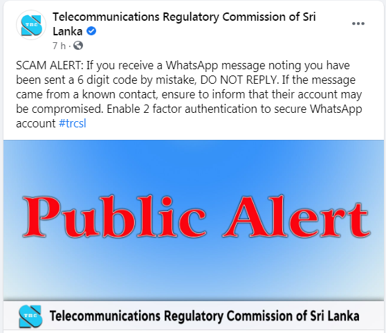 එමෙන් ම තම WhatsApp ගිණුම් ආරක්ෂා කර ගැනීම සඳහා 2 Factor Authentication සක්රීය කරගන්නා ලෙස ද විදුලි සංදේශ නියාමන කොමිෂන් සභාව WhatsApp පරිශීලකයින්ට දැනුම් දෙයි.