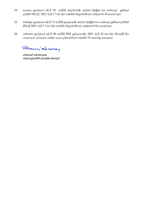 කොරෝනා ආසාදනය වී මියගිය තවත් පුද්ගලයන් 36 දෙනකුගේ මරණ පිළිබඳ රජය ඊයේ (19) නිල වශයෙන් නිවේදනය කිරීමත් සමඟ මෙරට තහවුරු කරන ලද කොරෝනා ආසාදිත මරණ සංඛ්යාව 1,051ක් දක්වා ඉහළ ගොස් තිබේ.