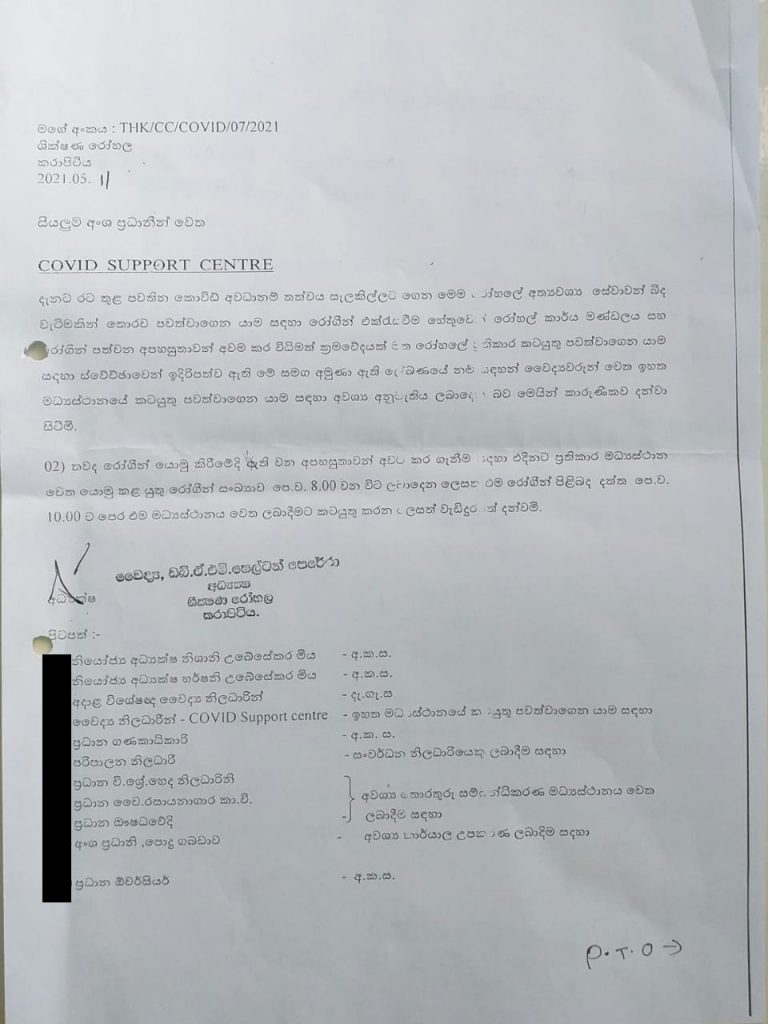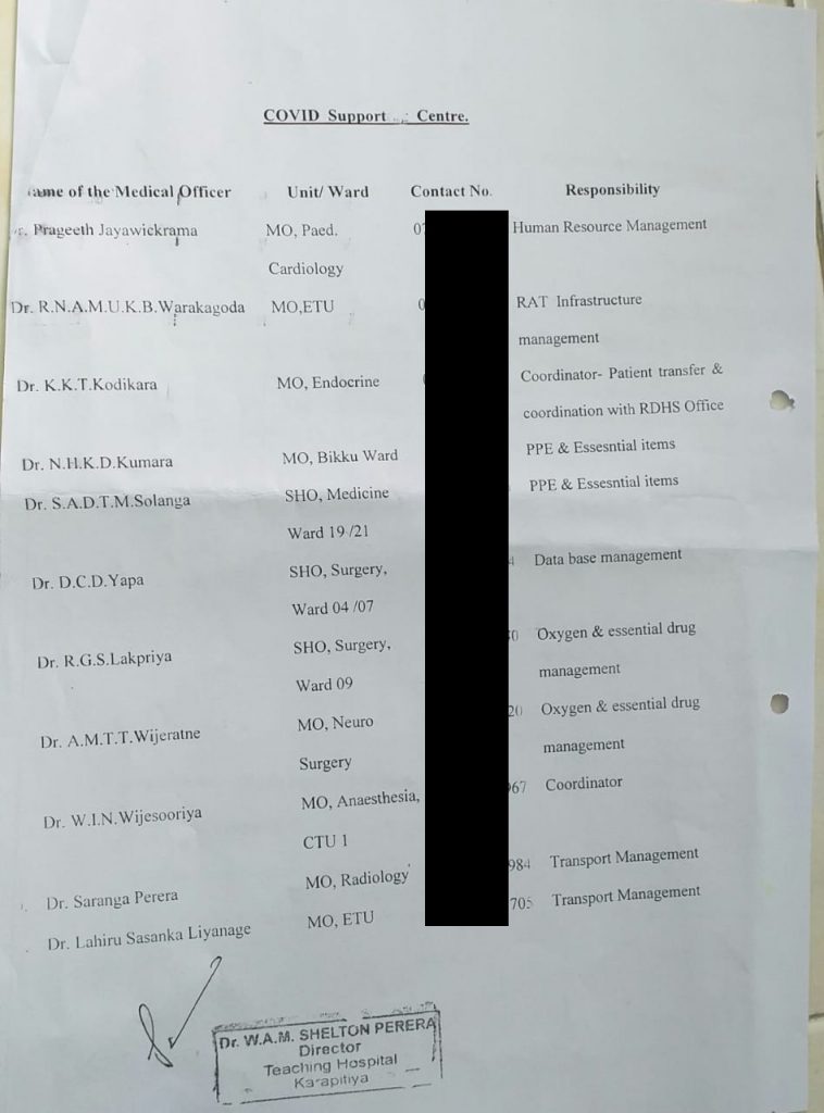 කරාපිටිය ශික්ෂණ රොහලේ අධ්යක්ෂ වෛද්ය ෂෙල්ටන් පෙරේරාගේ අත්සනින් නිකුත් කර ඇති ලිපියකින් වෛද්යවරුන් පිරිසකට එම බලය පවරා තිබේ. එහි දැක්වෙන්නේ රෝහලේ අත්යාවශ්ය සේවා බිඳවැටීමකින් තොරව පවත්වාගෙන යාම සඳහා මේ වෛවද්යවරු ස්වේච්ඡාවෙන් ඉදිරිපත් වී ඇති බවයි. මෙම කොරෝනා සහය මධ්යස්ථානයට විශේෂඥ වෛද්යවරුන්ගේ ද දැඩි විරෝධයක් මේ වනවිට එල්ල වී තිබේ.