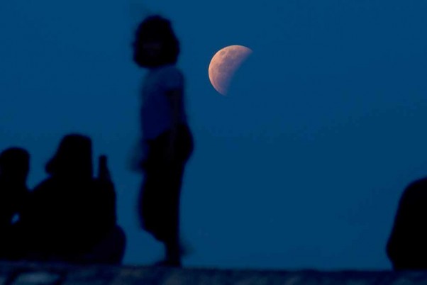 නිවැසියන් පිරිසක් ඉන්දුනීසියාවේ බාලි හි සනූර් වෙරළට වී චන්ද්රග්රහණය නරඹති. (AP ඡායාරූපය ෆිර්ඩියා ලිස්නාවතී)