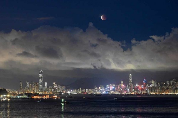 හොංකොං හි වික්ටෝරියා වරායට ඉහළින් නැග ආ චන්ද්රයා (AP ඡායාරූපය කිං චියුන්ග්)