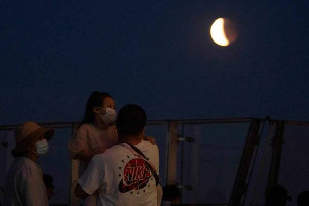 බීජිංහි ඔලිම්පික් කුළුණට නැග චන්ද්රග්රහණය දෙස බලා සිටින පුද්ගලයන් (AP ඡායාරූපය එන්හැන් ගුවාන්)