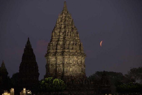 09 වැනි සියවසේ දී ඉන්දුනීසියාවේ යෝගියාකාර්තා හි ඉදිකර ඇති ප්රම්බානන් දේවස්ථාය පසුබිමෙන් චන්ද්රයා නැගී එනවිට චන්ද්රග්රහණ්ය දිස්වන ආකාරය (AP ඡායාරූපය ස්ලමෙට් රියාඩි)