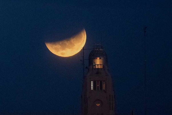 උරුගුවේ මොන්ටෙවීඩියෝ වරායට පිටුපසින් චන්ද්රග්රහණය සිදුවන ආකාරය කැමරාවට නගා ඇත්තේ මේ ආකාරයෙනි. (AP ඡායාරූපය මැටිල්ඩ් කැම්පෝඩොනිකෝ)