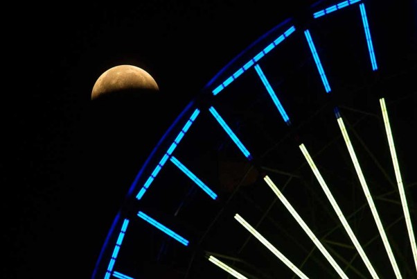 කැලිෆෝනියාවේ සැන්ටා මොනිකා හි ෆෙරිස් රෝදයක් පිටුපසින් චන්ද්රග්රහණය දිස්වන ආකාරය