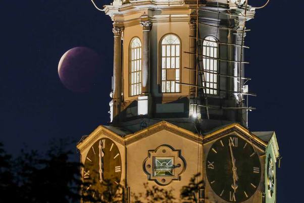 පිලිපීනයේ මැනිලා නගර ශාලාවේ ඔරලෝසු කණුව අසළින් චන්ද්රග්රහණය දිස්වෙයි.