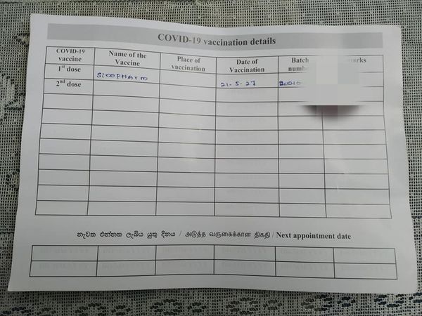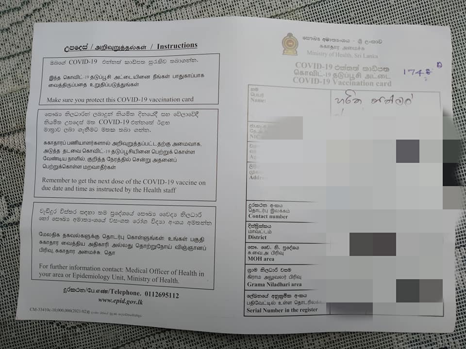 එන්නත් ලබාගැනීමේ දී දුන් කාඩ් පතක් බිම වැටී තිබී දහනායකට හමුවී තිබේ. එහි නමක් හෝ පදිංචි ස්ථානයක් සටහන්ව නොතිබීම ද විශේෂත්වයකි.