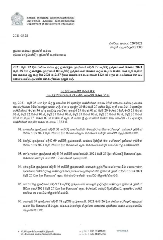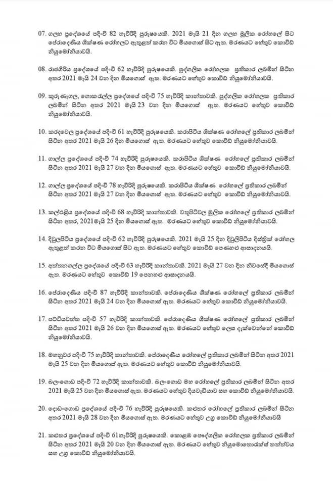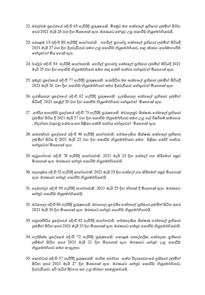 සෞඛ්ය සේවා අධ්යක්ෂ ජනරාල්වරයා විසින් නිකුත් කර ඇති මරණ සංඛ්යාව පසුගිය අප්රේල් 29 සිට මැයි 27 දක්වා සිදුවූ මරණ බව ද සඳහන් කර තිබේ.