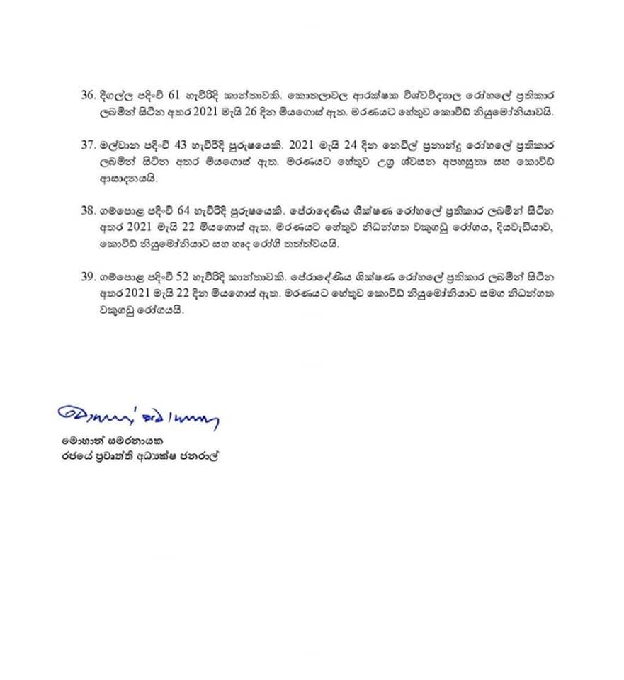 කොරෝනා ආසාදනය වී මියගිය පුද්ලයන් 39 දෙනකුගේ විස්තර ඊයේ (28) සෞඛ්ය සේවා අධ්යක්ෂ ජනරාල්වරයා විසින් නිකුත් කර තිබූ අතර කොරෝනා ආසාදිතයන් 2,465 දෙනකු පිළිබඳ ද විස්තර නිකුත්කර තිබිණි.