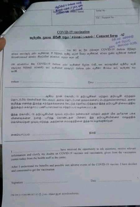 මහනුවර ප්රදේශ කිහිපයක දී අද (31) එන්නත් ලබාගත් අයට “කැමැත්ත ප්රකාශ කිරීමේ පත්රිකාවක් ලබා දී තිබිණි. සිංහල, දෙමළ හා ඉංග්රීසි භාෂා තුනෙන් ම රජයේ මුද්රණාලයේ මුද්රණය කර ඇති එම පත්රිකාවේ දැක්වෙන්නේ එන්නත ගැනීමට පෙර සෞඛ්ය වෛද්ය නිලධාරීවරයා විසින් පැහැදිලිකර දුන් කරුණු අවබෝධ කරගෙන ඒවාට එකඟව මේ එන්නත ලබාගන්නා බවයි.