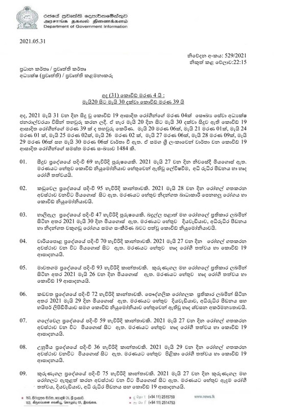 මෙරට සිදුව ඇති කොරෝනා ආසාදිත මරණ අතරින් සෞඛ්ය සේවා අධ්යක්ෂවරයා විසින් වාර්තා කරන ලද කොරෝනා ආසාදිත මරණ සංඛ්යාව මේ වනවිට 1,484ක් බවට පත්ව ඇත. ඒ ඊයේ (31) තවත් කොරෝනා මරණ 43ක් වාර්තා කිරීමත් සමඟිනි.