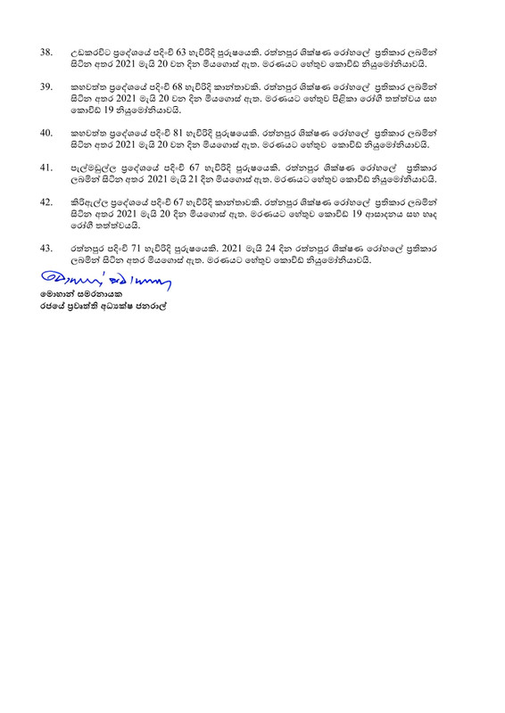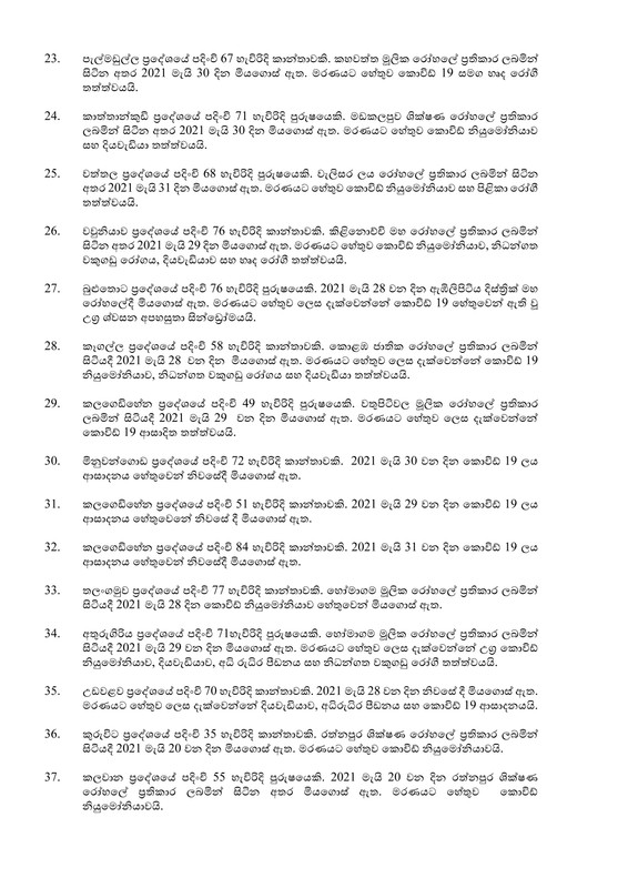 ඊයේ වාර්තා කළ මරණ 43න් 23ක් ම කාන්තා මරණ බව ද රජයේ ප්රවෘත්ති දෙපාර්තමේන්තුවේ මාධ්ය නිවේදනය අනුව පැහැදිලි වේ.
