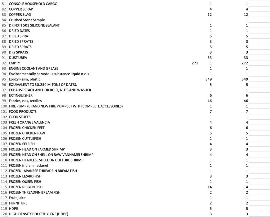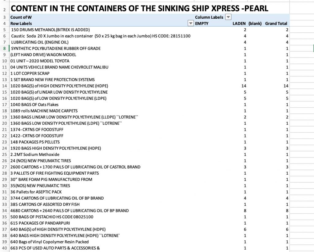 ගිනිගෙන විනාශ වූ X-Press Pearl නෞකාවේ තිබූ ද්රව්ය පිළිබඳ ලේඛනයක් පාරිසරික යුක්ති කේන්ද්රයේ විධායක අධ්යක්ෂ හේමන්ත විතානගේ විසින් ප්රසිද්ධියට පත්කර තිබේ.