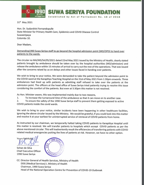 ඔහු මේ බව රාජ්ය අමාත්ය විශේෂඥ වෛද්ය සුදර්ශනී ප්රනාන්දුපුල්ලේ වෙත ලිඛිතව දැනුම් දී තිබේ.