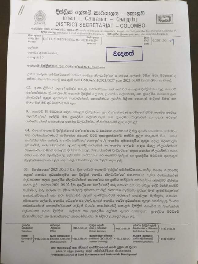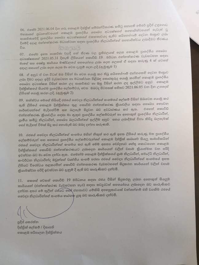 කොළඹ දිස්ත්රිකයේ සියලුම ප්රාදේශීය ලේකම්වරුන්, සියලුම සහකාර ප්රාදේශීය ලේකම්වරුන්, සියලුම ග්රාම නිලධාරීන්, සමෘද්ධි නිලධාරීන් සහ සංවර්ධන නිලධාරීන් පවසන්නේ කොළඹ දිස්ත්රික් එන්නත්කරණ වැඩසටහන විධිමත් කිරීම සඳහා රජයේ ඉල්ලීම මත අවශ්ය උපරිම සහයෝගය ලබාදුන් බවයි. මේ සම්බන්ධයෙන් සාකච්ඡා වට ගණනාවක් පවත්වා එකඟතාවලට එළැඹි බවත් ඒ අනුව ජනතාවට වඩාත් පහසුවෙන් එන්නත් ලබාගැනීමේ වැඩපිළිවෙලක් සැකසූ බවත් දිසාපතිවරයා සෞඛ්ය අමාත්යාංශයේ ලේකම්වරයාට එම ලිපිය මගින් සිහිපත් කර ඇත.