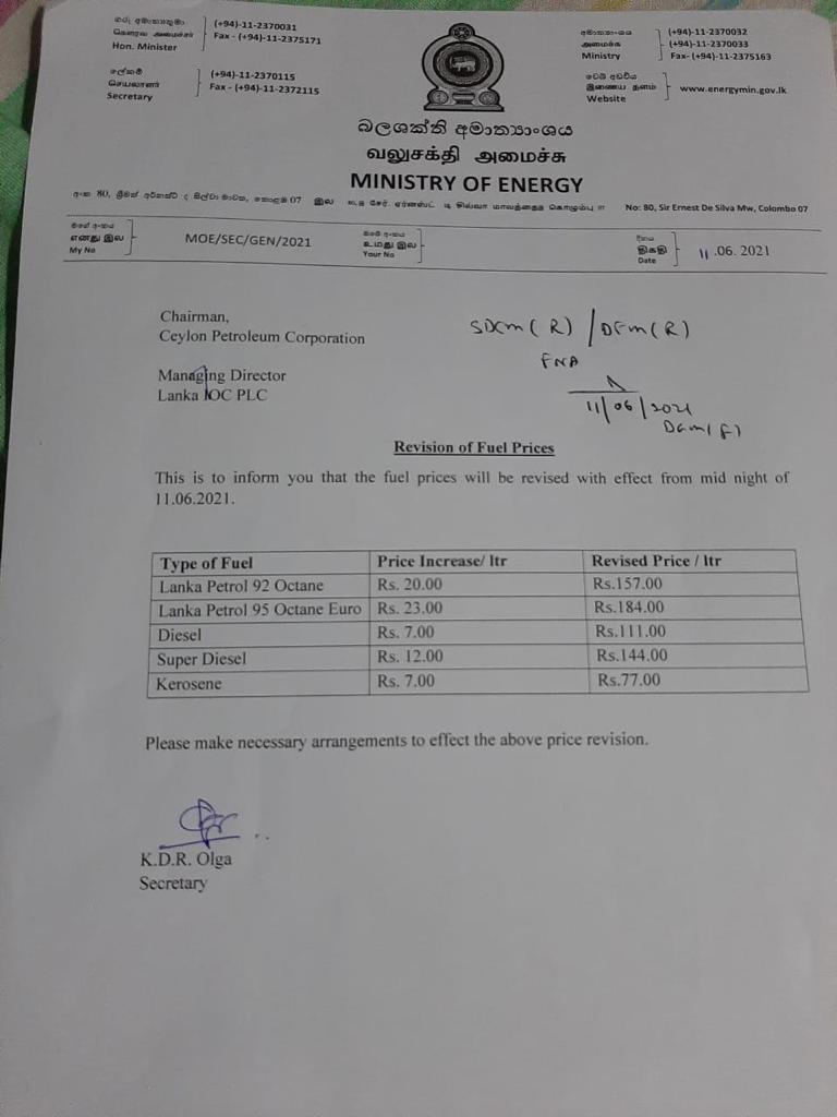 පෙට්රල් (ඔක්ටේන් 95) – රුපියල් 184.00 ( වැඩිවන මිල රුපියල් 23.00)