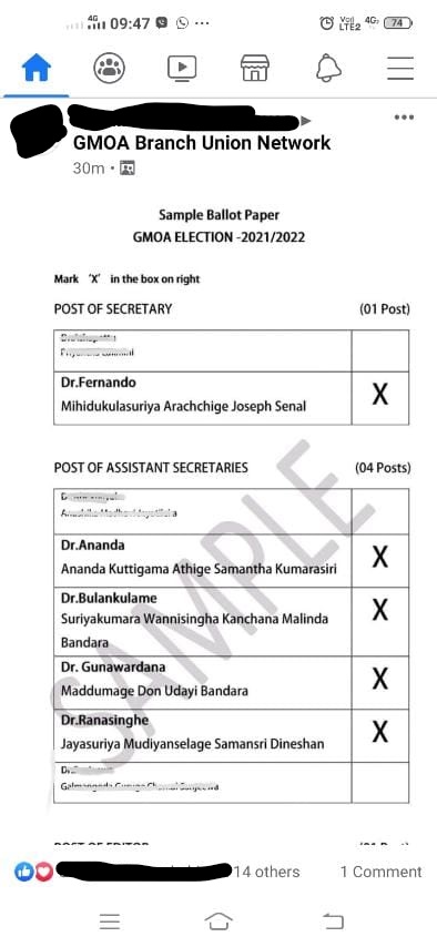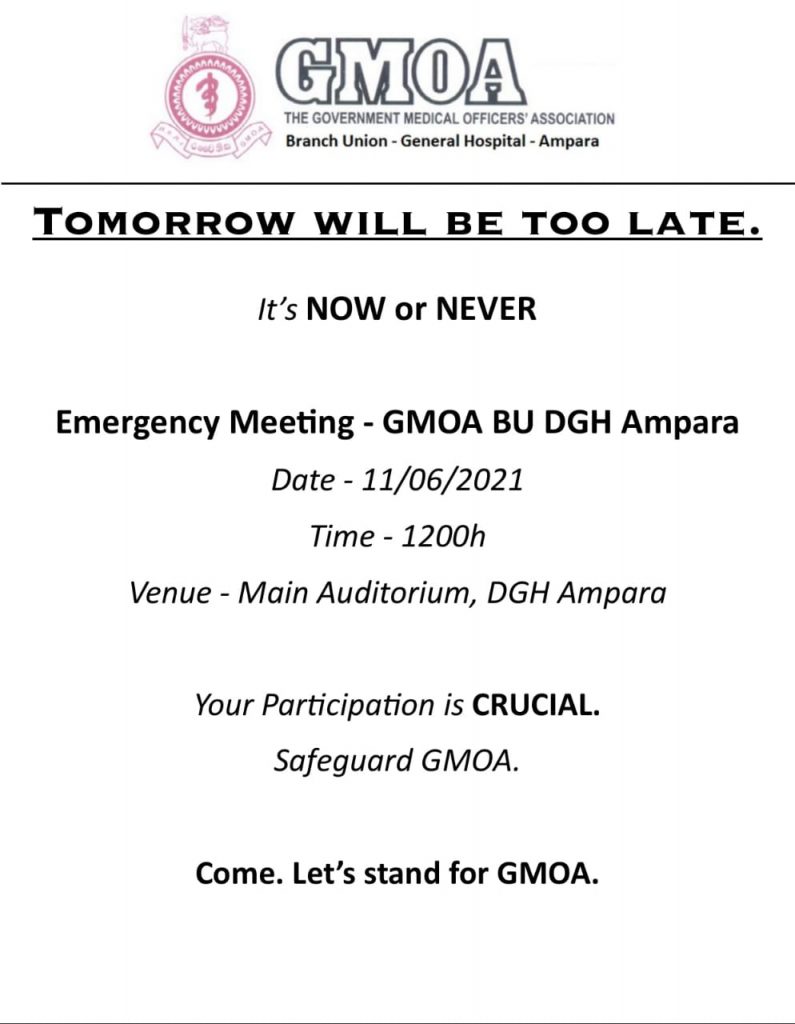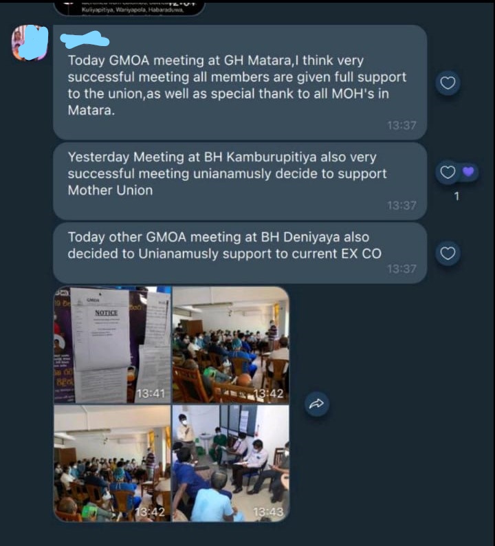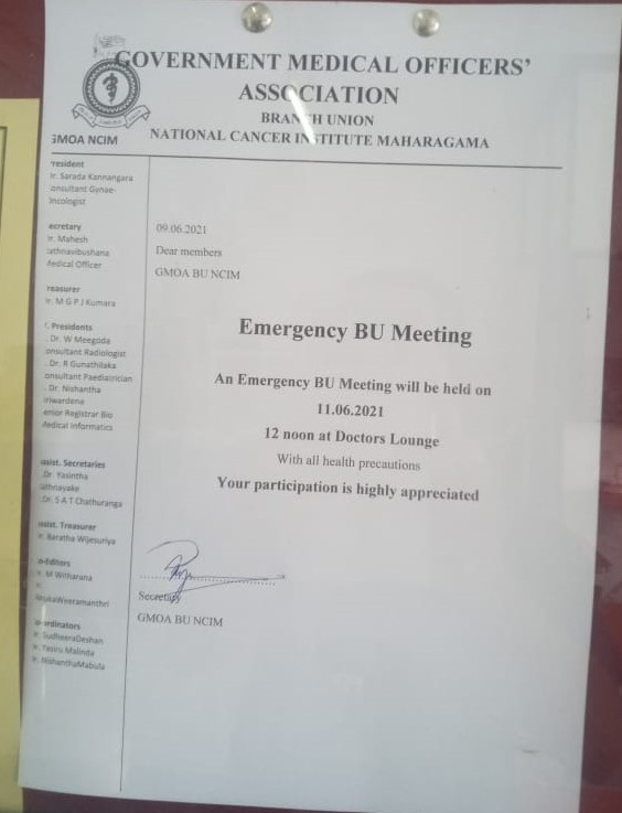 නමුත් රජයේ වෛද්ය නිලධාරීන්ගේ සංගමයේ එක්තරා පිරිසක් රටේ පවතින නිරෝධායන නීති තුට්ටුවකට හෝ මායිම් නොකර රැස්විම් පවත්වන්නේ මේ ආකාරයෙනි. ඔවුන් තමන්ගේ වෘත්තීය සමිති මැතිවරණ ව්යාපාරය වෙනුවෙන් රට පුරාම රජයේ වෛද්ය නිලධාරීවරුන්ගේ සංගමයේ සියලු ශාඛාවල මෙවැනි රැස්වීම් පැවැත්වීමට කටයුතු කර ඇත.