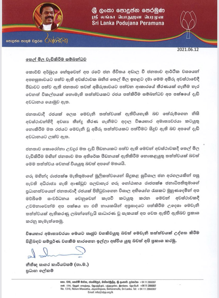 මෙලෙස ඉන්ධන මිල ඉහළ දැමීමෙන් ජනතාව මත අතිරේක පීඩනයක් ඇතිකිරීම නොකළයුතු බවත් දැනුම් දී ඇත.