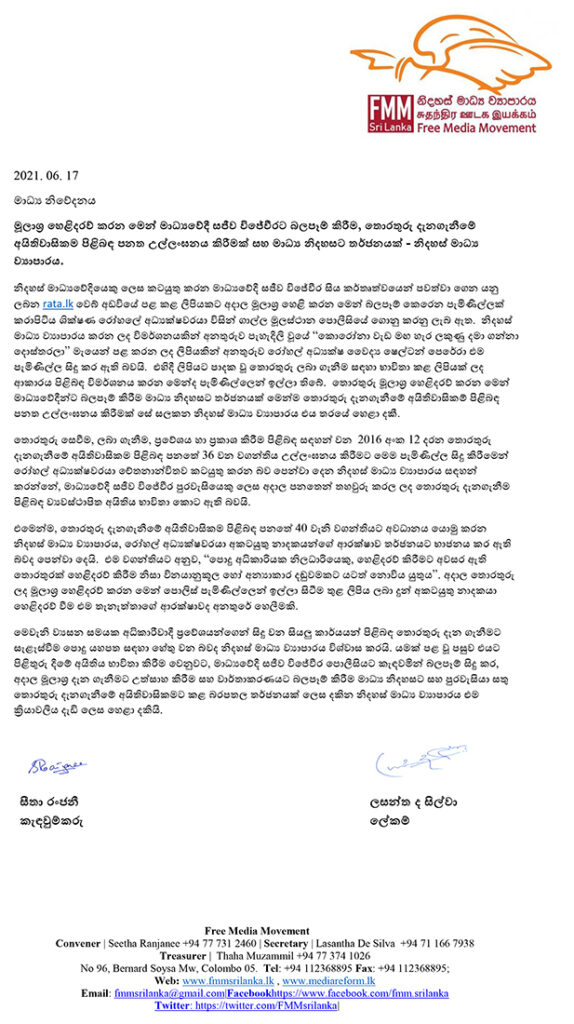 නිදහස් මාධ්ය ව්යාපාරයේ ලේකම් ලසන්ත ද සිල්වා සහ කැඳවුම්කරු සීතා රංජනී දෙදෙනාගේ අත්සනින් නිකුත් කරන ලද එම නිවේදනය සම්පූර්ණයෙන් ම පහත දක්වා ඇත.