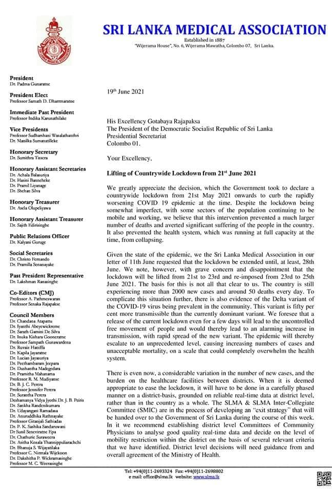 ඉන්දියාවට විශාල බලපෑමක් සිදුකළ කොරෝනා වයිරසයේ ඉන්දියානු ප්රභේදය ශ්රී ලංකාවෙන් ද හමුවී ඇති බැවින් 21 වැනි දින සංචරණ සීමා ලිහිල් නොකරන ලෙස ශ්රී ලංකා වෛද්ය සංගමය ජනාධිපති ගෝඨාභය රාජපක්ෂගෙන් ඉල්ලීමක් කර තිබේ.