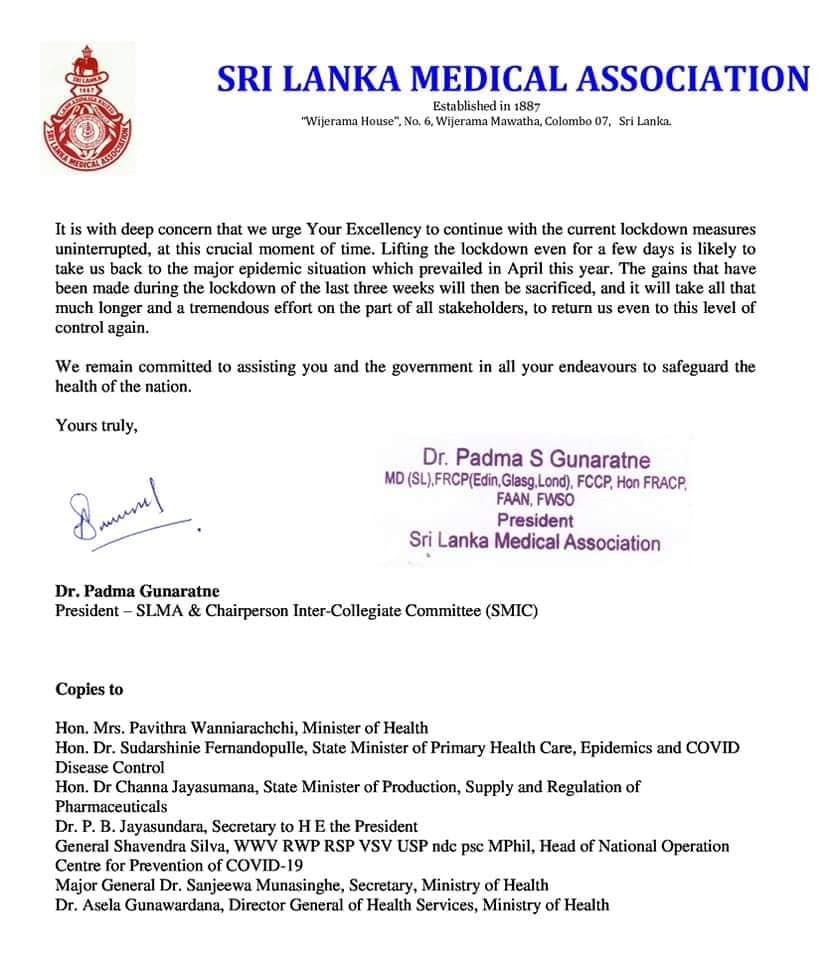 එහි සභාපති පද්මා එස් ගුණරත්නගේ අත්සනින් යුතුව යවන ලද ඉල්ලීමේ ලිපියේ පිටපත් සෞඛ්ය අමාත්ය පවිත්රා වන්නිආරච්චි, රාජ්ය අමාත්ය සුදර්ශනී ප්රනාන්දුපුල්ලේ, රාජ්ය අමාත්ය චන්න ජයසුමන, ජනාධිපති ලේකම් පී.බී.ජයසුන්දර, කොවිඩ් – 19 පැතිරීම වැළැක්වීමේ ජාතික ක්රියාන්විත මධ්යස්ථානයේ ප්රධානී යුද හමුදාපති ජනරාල් ශවේන්ද්ර සිල්වා, සෞඛ්ය අමාත්යාංශයේ ලේකම් මේජර් ජනරාල් වෛද්ය සංජීව මුණසිංහ, සෞඛ්ය සේවා අධ්යක්ෂ වෛද්ය අසේල ගුණවර්ධන යන අයට ද යවා තිබේ.