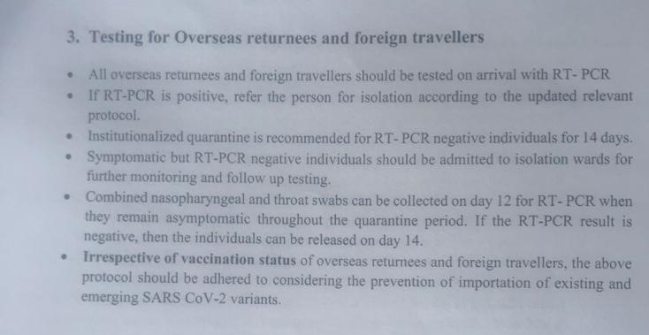 විදේශ රටක සිට මෙරටට පැමිණෙන පුද්ගලයන් නිරෝධායනය විය යුතු ක්රමවේදය වරින්වර වෙනස් කරනු ලැබූ අතර මේ වනවිට සෞඛ්ය අමාත්යාංශයේ නිර්දේශය වන්නේ එන්නත් දෙකම ලබාගත් පුද්ගලයකු වුව ද ශ්රී ලංකාවට පැමිණ කරනු ලබන PCR පරීක්ෂණයකින් ඔහු කොරෝනා ආසාදිත නැතැයි තහවුරු වුව ද දින 14ක් නිරෝධායනය අනිවාර්ය බවයි.