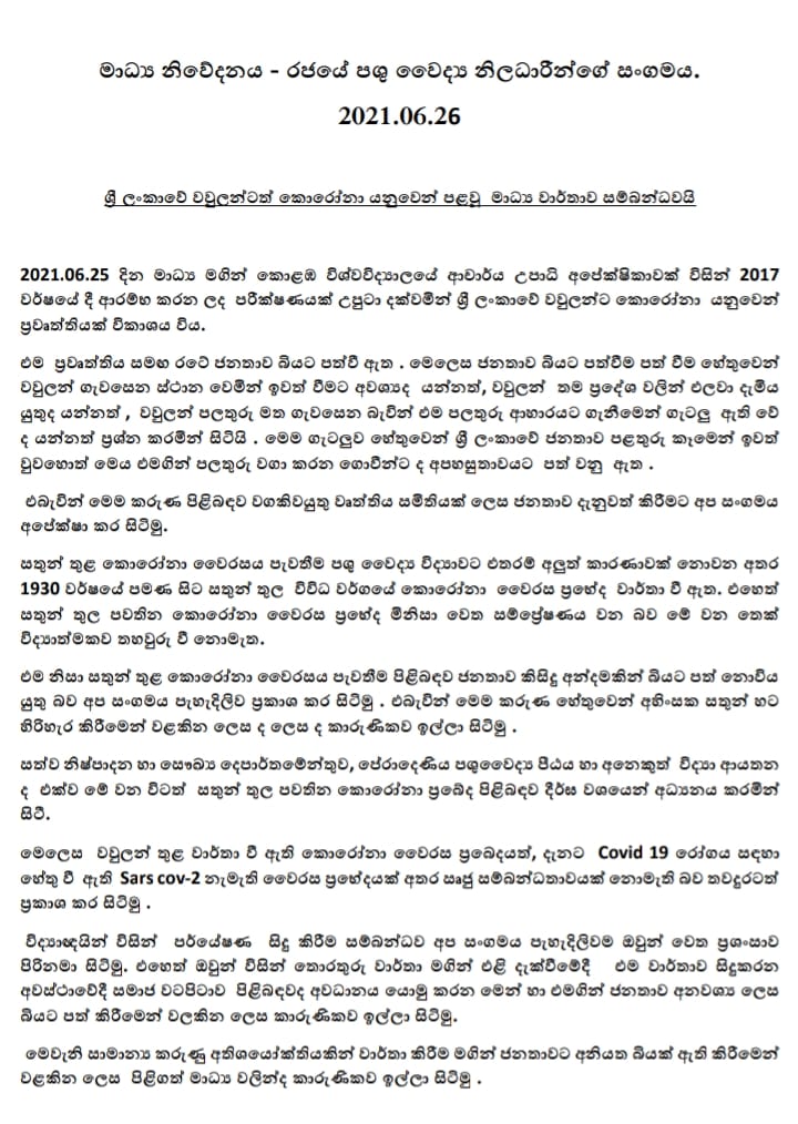 මේ පිළිබඳ රජයේ පශු වෛද්ය නිලධාරීන්ගේ සංගමය නිවේදනයක් නිකුත් කරමින් පවසන්නේ සතුන්ගෙන් මිනිසුන්ට කොරෝනා වයිරසය බෝවන බවට කිසිදු විද්යාත්මක තහවුරු කිරීමක් මෙතෙක් සිදුව නැති බවයි. එබැවින් වවුලන් ඇතුළු සතුන්ට අනවශ්ය ලෙස බිය නොවිය යුතු බවත් ඔවුන්ට හිංසා නොකළ යුතු බවත් පශු වෛද්යවරු අවධාරණය කරයති.