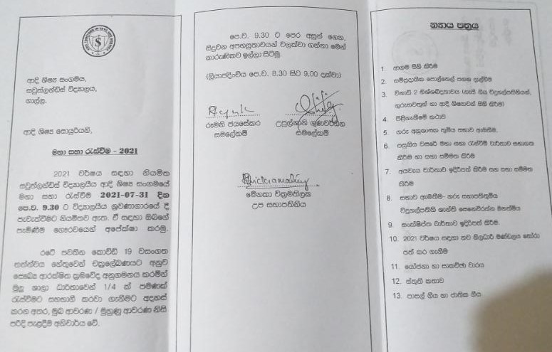 ඔවුන් විසින් ඒ බව දක්වමින් සෑම සාමාජිකාවකට ම ලිපි තැපැල් කරමින් තිබෙන අතර එහි දැක්වෙන්නේ ජූලි මස 31 වැනි දින උදෑසන 9.30ට ආදි ශිෂ්ය සංගමයේ මහ සභා රැස්වීම විද්යාලයීය ශ්රවණාගාරයේ දී පැවැත්වෙන බවයි.