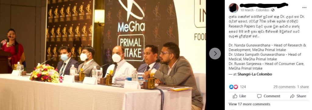 ඒ බව ඔහුගේ facebook ගිනුමේ තැබූ සටහන්වලින් ද පැහැදිලිවෙයි. කිසිදු රසායනාගාර පරීක්ෂණයකින් හෝ වෙනත් ආකාර විද්යාත්මක පරීක්ෂණයකින්, සායනික පරීක්ෂණයකින් හෝ සනාථ නොවූ සහ ව්යාජ ලෙස ISO තත්ව සළකුණු භාවිතා කරමින් ජනතාව රවටා මුදල් ගරන මේ ජාවාරමේ එළිදැක්වීම සඳහා ෂැංග්රිලා හෝටලයේ පැවැත්වූ උත්සවයේ ප්රධාන මේසයේ ද වාඩිවී සිටියි.