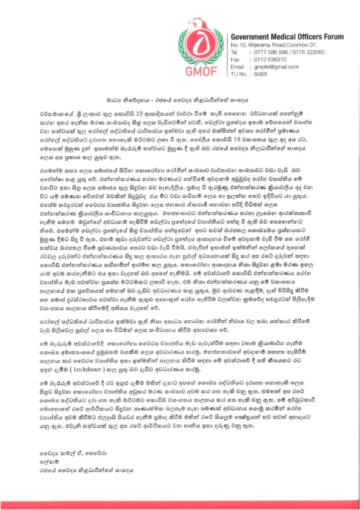 “මෙරට රෝහල් පද්ධතියට දරාගත නොහැකි තරමට මේ වනවිට රෝගීන් වාර්තා වෙමින් පවතී. ඔක්සිජන් අවශ්යවන රෝගීන් සංඛයාව ද වේගයෙන් ඉහළ යමින් පවතී. කොරෝනා වසංගතය තුළ අප රට මෙතෙක් මුහුණ දුන් දරුණුම තත්වයට අද පත්ව ඇත. දිනකට වාර්තාවන රෝගීන් සංඛ්යාවට වඩා කිහිප ගුණයක් වැඩි රෝගීන් සංඛ්යාවක් සමාජය තුළ සිටිති. ප්රමාද වී ලැබුණු එන්නත්කරණ ක්රියාවලිය දැනට වේගවත්ව සිදුවුව ද මහජනතාවගේ හැසිරීම ඩෙල්ටා ප්රභේදයේ ව්යාප්තියට හේතුවී තිබෙන බව අප විසින් හඳුනාගෙන තිබේ. මෙම බැරෑරුම් අවස්ථාවේ දී කොරෝනා ව්යාප්තිය මැඩ පැවැත්වීම සඳහා වහාම ක්රියාමාර්ග ගැනීම සෞඛ්ය අමාත්යාංශයේ ප්රමුඛතම වගකීම ලෙස අපි අවධාරණය කරන්නෙමු. මහජනතාවගේ අවදානම් සහගත හැසිරීම් පාලනය කර වයිරස ව්යාප්තිය පාලනය කිරීම සඳහා මේ අවස්ථාවේ දී සති කිහිපයකට රට අඟුළු දැමිය යුතු බව ද දැඩිව අවධාරණය කරමු. එමගින් රෝගීන් සංඛ්යාව අඩුකරගැනීමටත් මරණ සංඛයාව අවම කරගැනීමත් හැකිවනු ඇත. මේ අවස්ථාවේ ආර්ථිකයට සිදුවන සෘණාත්මක බලපෑම ගැන පමණක් අවධානය යොමු කරමින් රෝග ව්යාප්තිය අවම කිරීමට ඵලදායී පියවර ගැනීම ප්රමාද කිරීම මගින් රටේ සියුලම ක්ෂේත්රයන් තව තවත් ආගාදයට යනු ඇත. එවැනි තත්වයක දී රටේ ආර්ථියට වන හානිය ඉතා දරුණු වනු ඇත.”