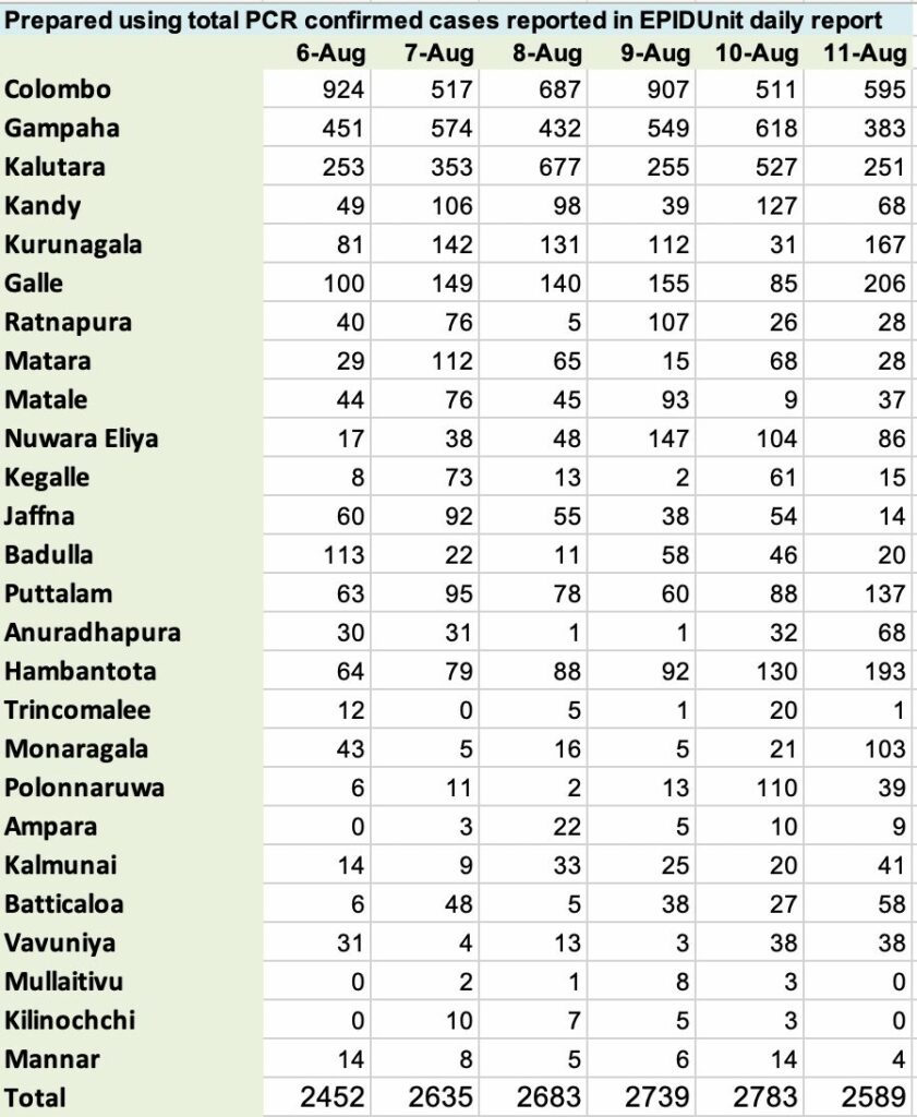 මේ දැක්වෙන්නේ වසංගත රෝග විදයා අංශයේ දිනපතා වාර්තාවේ එක් එක් දිස්ත්රික්කවලින් වාර්තා වූ රෝගීන් පිළිබඳ ලේඛනයයි
