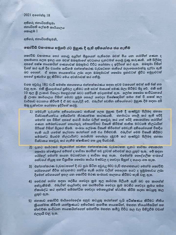 එම කරුණු ද දක්වමින් “කොවිඩ් වසංගතය හමුවේ රට මුහුණ දී ඇති අභියෝග ජය ගැනීම” යනුවෙන් ජනාධිපතිවරයාට යොමුකර ඇති පිටු දෙකකින් සමන්විත මෙම දීර්ඝ ලිපියේ කොරෝනා පාලනය සඳහා ගතයුතු පියවර 07ක් සඳහන් කර ඇත.