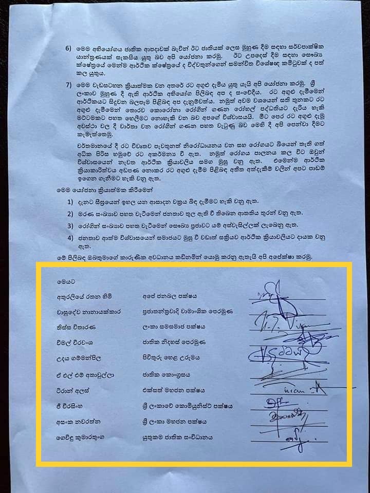 එම ලිපියට අපේ ජනබල පක්ෂයේ නායක පූජ්ය අතුරලියේ රතන හිමි, ප්රජාතන්ත්රවාදී වාමාංශික පෙරමුණේ වාසුදේව නානායක්කාර, ලංකා සම සමාජ පක්ෂයේ තිස්ස විතාරණ, ජාතික නිදහස් පෙරමුණේ විමල් වීරවංශ, පිවිතුරු හෙළ උරුමයේ උදය ගම්මන්පිළ, ජාතික කොංග්රසයේ ඒ.එල්.එම්.අතාවුල්ලා, එක්සත් මහජන පක්ෂයේ ටිරාන් අලස්, ශ්රී ලංකාවේ කොමියුනිස්ට් පක්ෂයේ ජී.වීරසිංහ, ශ්රී ලංකා මහජන පක්ෂයේ අසංක නවරත්න, යුතුකම ජාතික සංවිධානයේ ගෙවිඳු කුමාරතංගු යන පිරිස අත්සනත් තබා තිබේ.