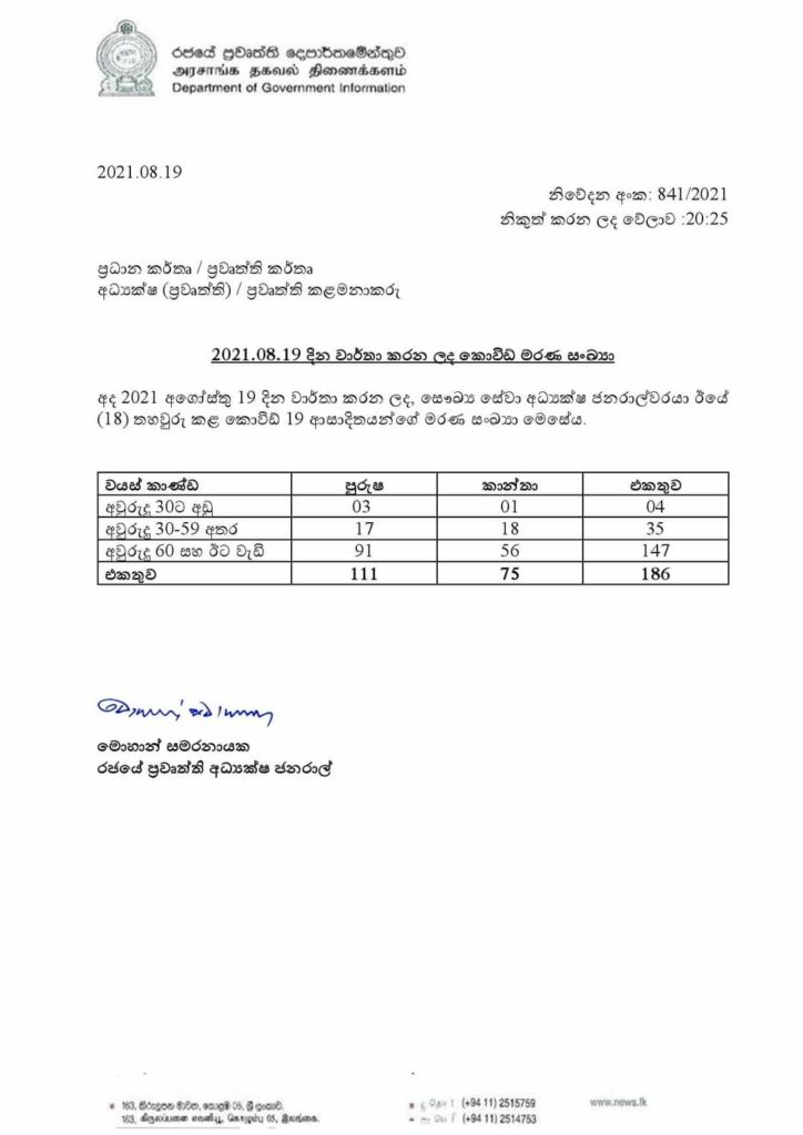 කොරෝනා ආසාදනයෙන් මියගිය පුද්ගලයන් 186 දෙනකු පිළිබඳ රජයේ සෞඛ්ය සේවා අධ්යක්ෂ ජනරාල්වරයා විසින් අද (19) තහවුරු කර තිබේ.