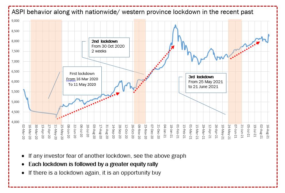 තුන්වන ලොක්ඩවුන් කාල සීමාව ක්රියාත්මක වූ 2021-05-25 සිට 2021-06-21 දින දක්වා සමස්ත කොටස් මිල දර්ශකය ඒකක 7,200 සිට ඒකක 8,300 දක්වා වර්ධනය වී තිබේ.